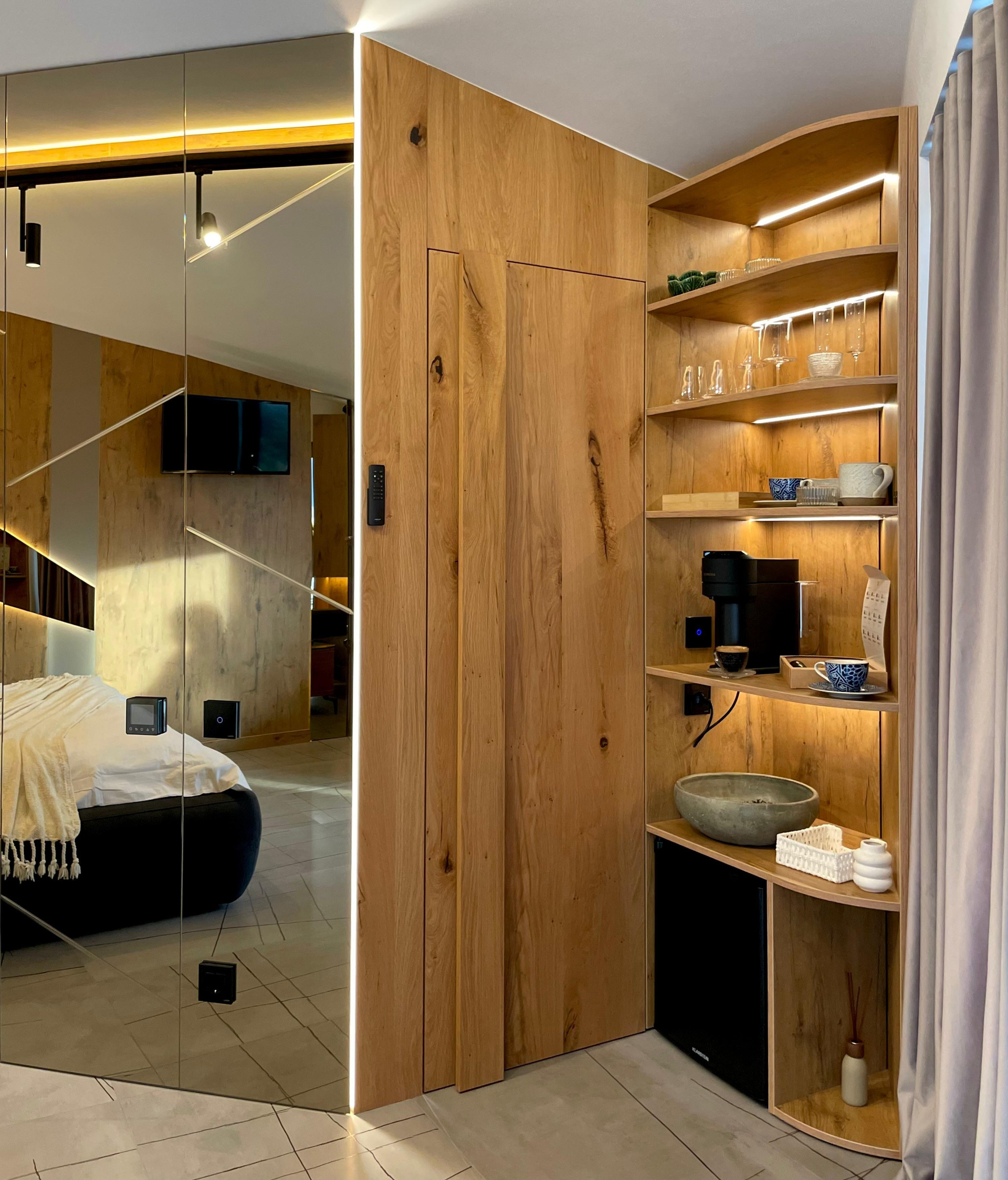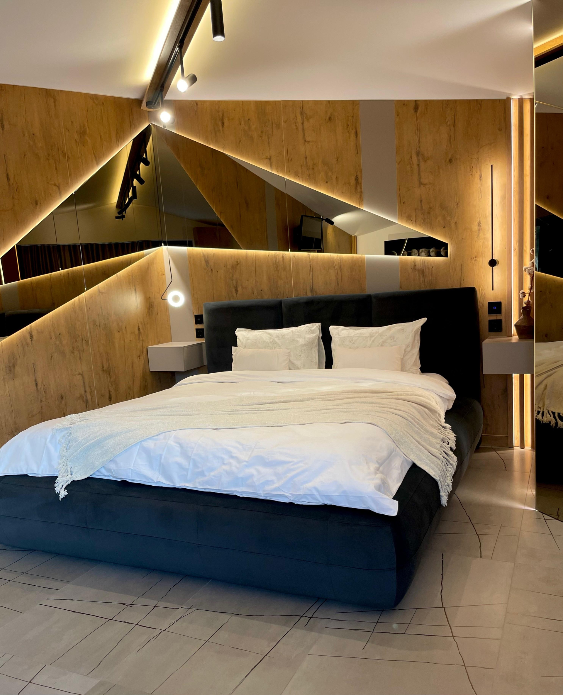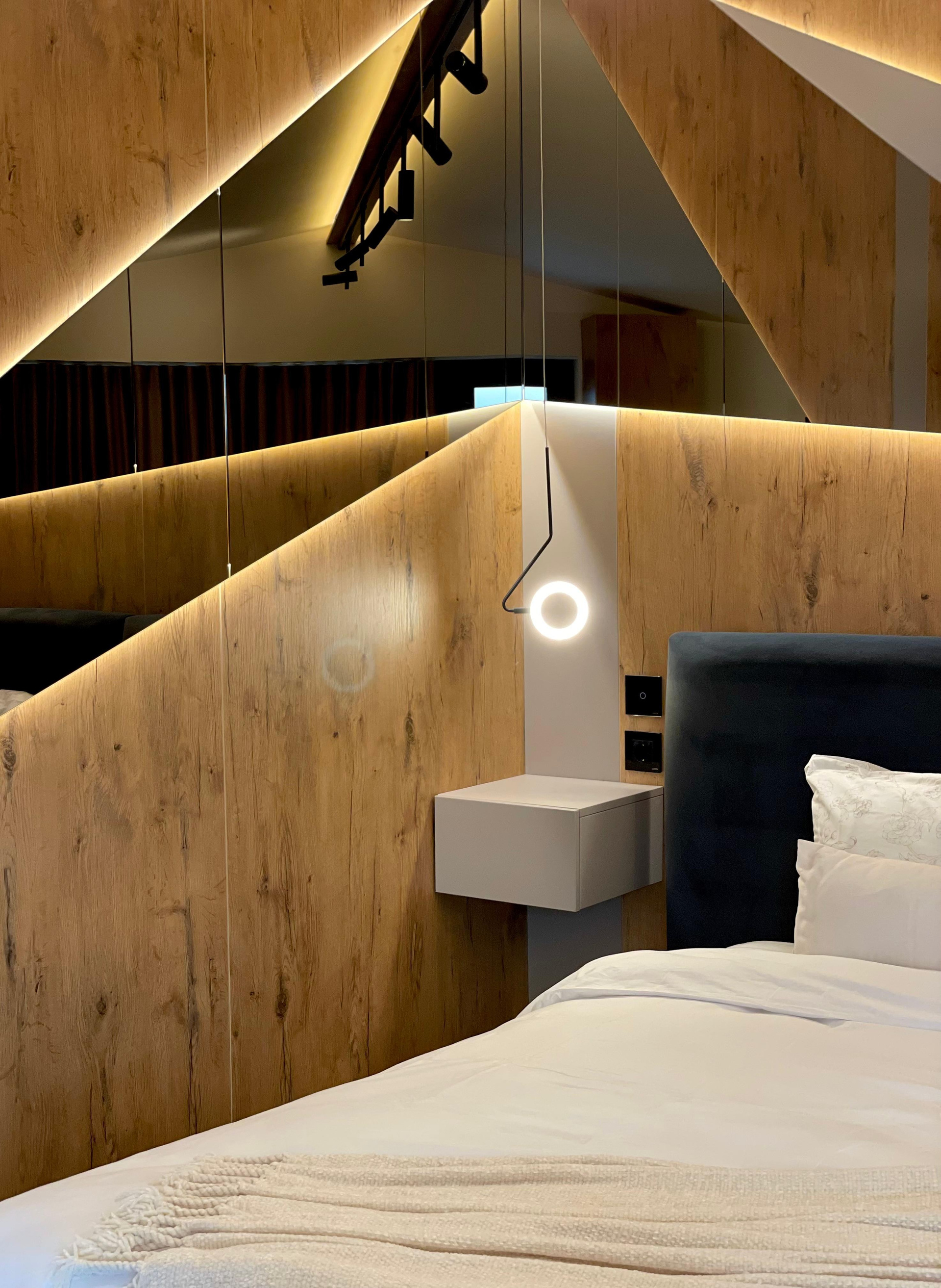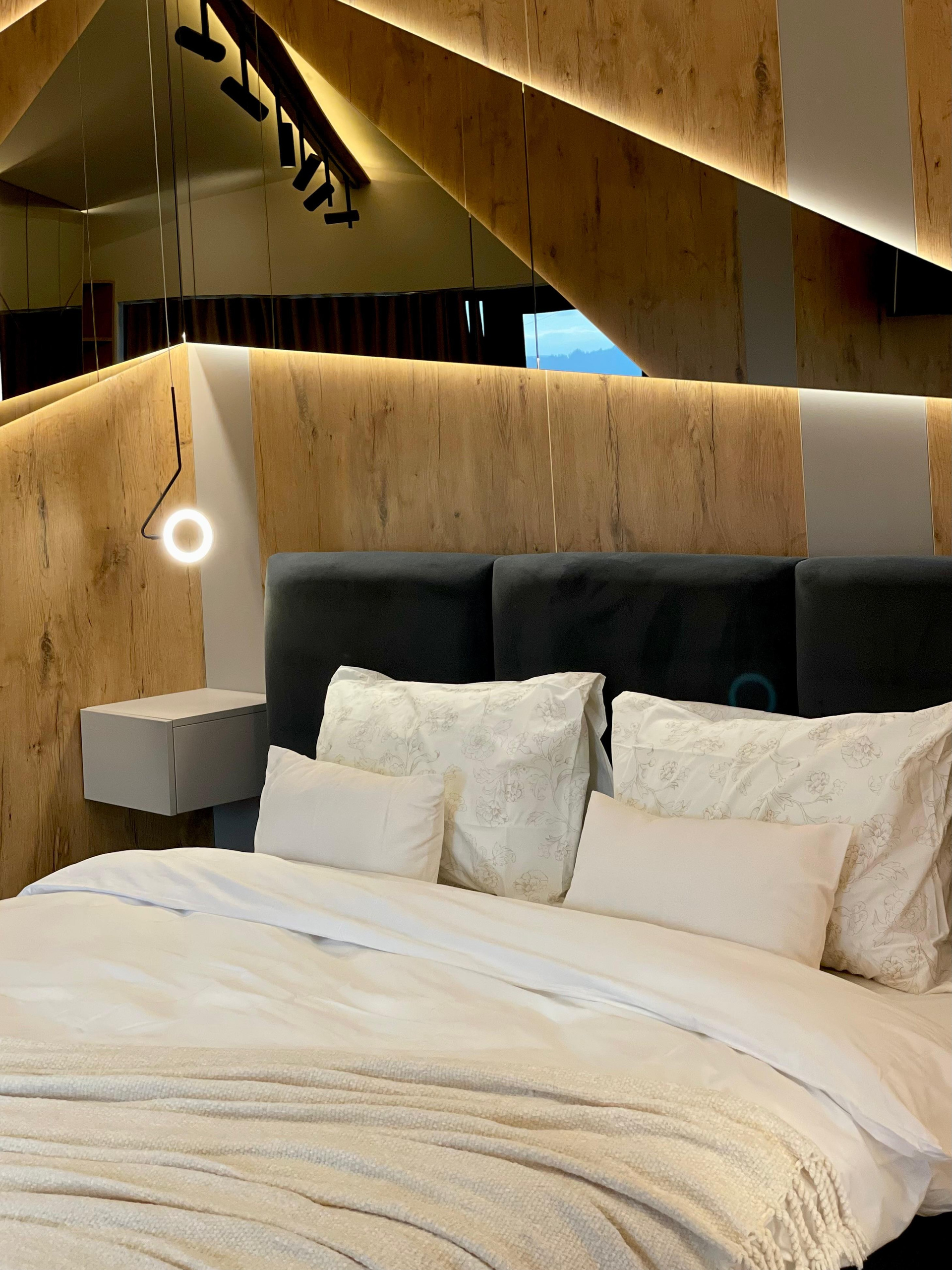 - Proiectul Amumi 1 aduce împreună naturalețea lemnului și eleganța modernă, creând un spațiu cald și intim. Jocurile geometrice ale oglinzilor și iluminarea ambientală dau profunzime și dinamism camerei, în timp ce texturile și culorile neutre transmit confort și rafinament. Rezultatul este un interior contemporan, primitor și sofisticat, unde funcționalitatea se îmbină armonios cu estetica.