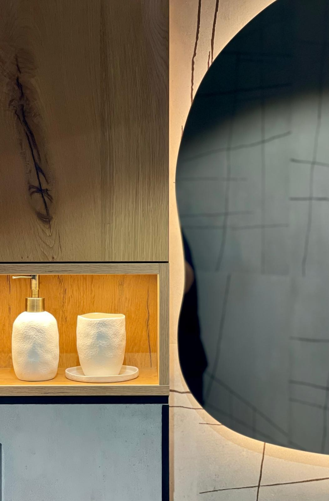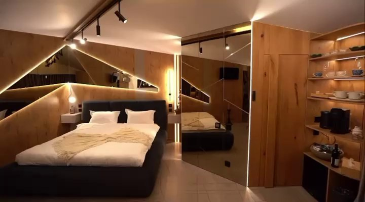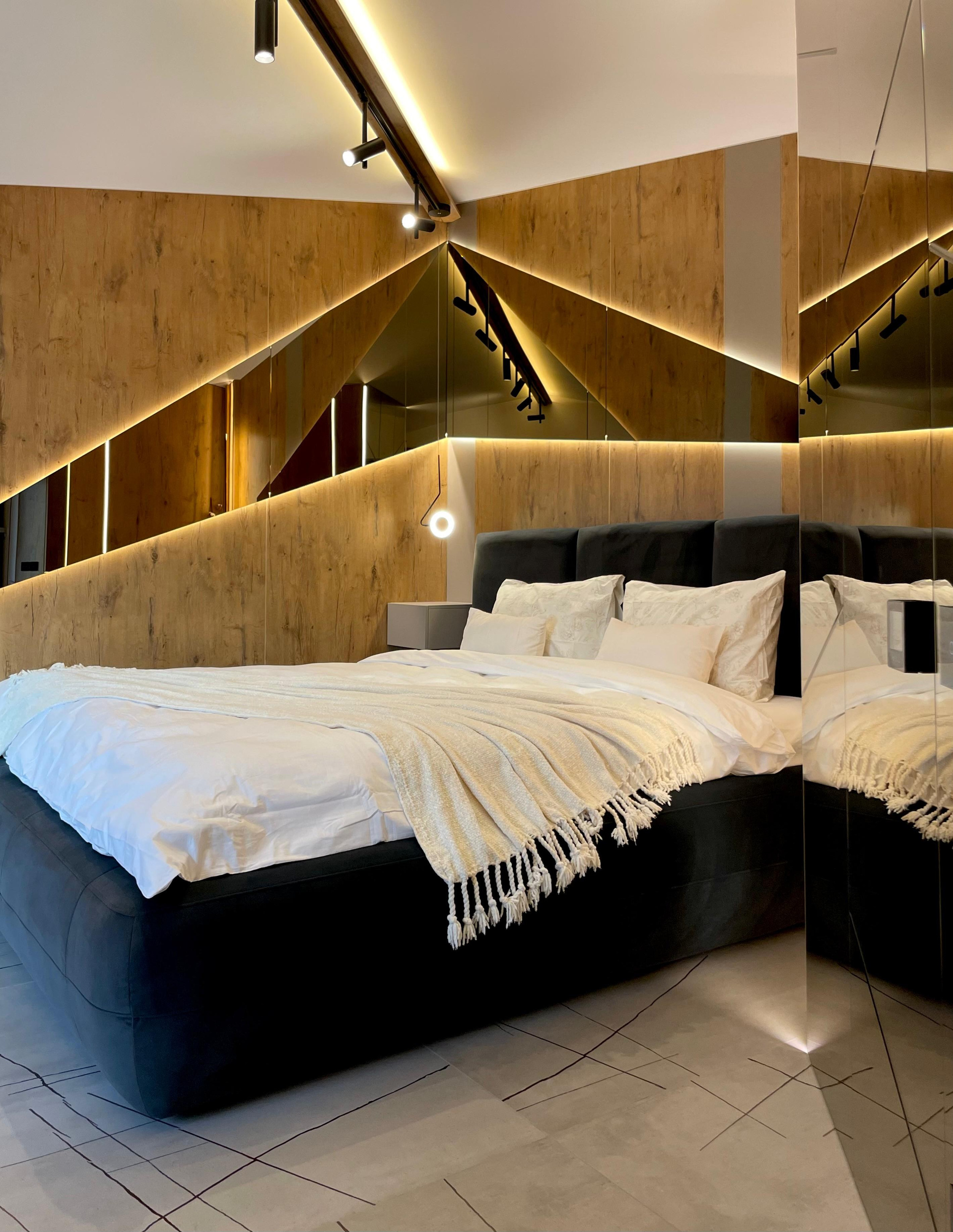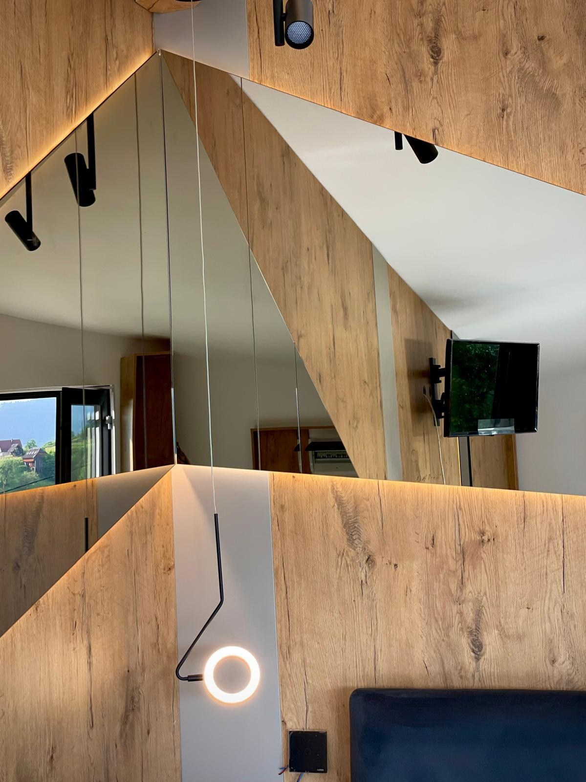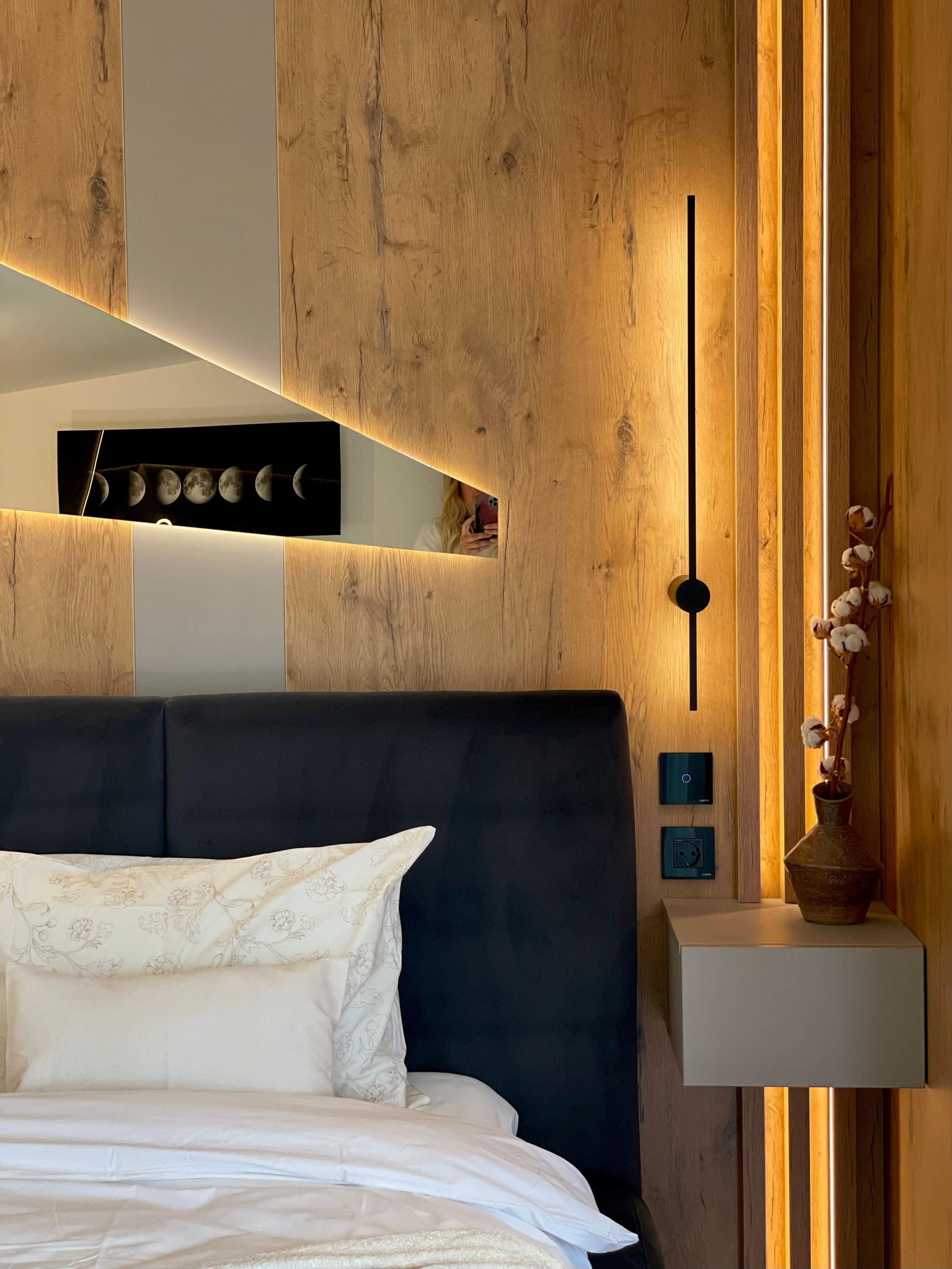 - Proiectul Amumi 1 aduce împreună naturalețea lemnului și eleganța modernă, creând un spațiu cald și intim. Jocurile geometrice ale oglinzilor și iluminarea ambientală dau profunzime și dinamism camerei, în timp ce texturile și culorile neutre transmit confort și rafinament. Rezultatul este un interior contemporan, primitor și sofisticat, unde funcționalitatea se îmbină armonios cu estetica.