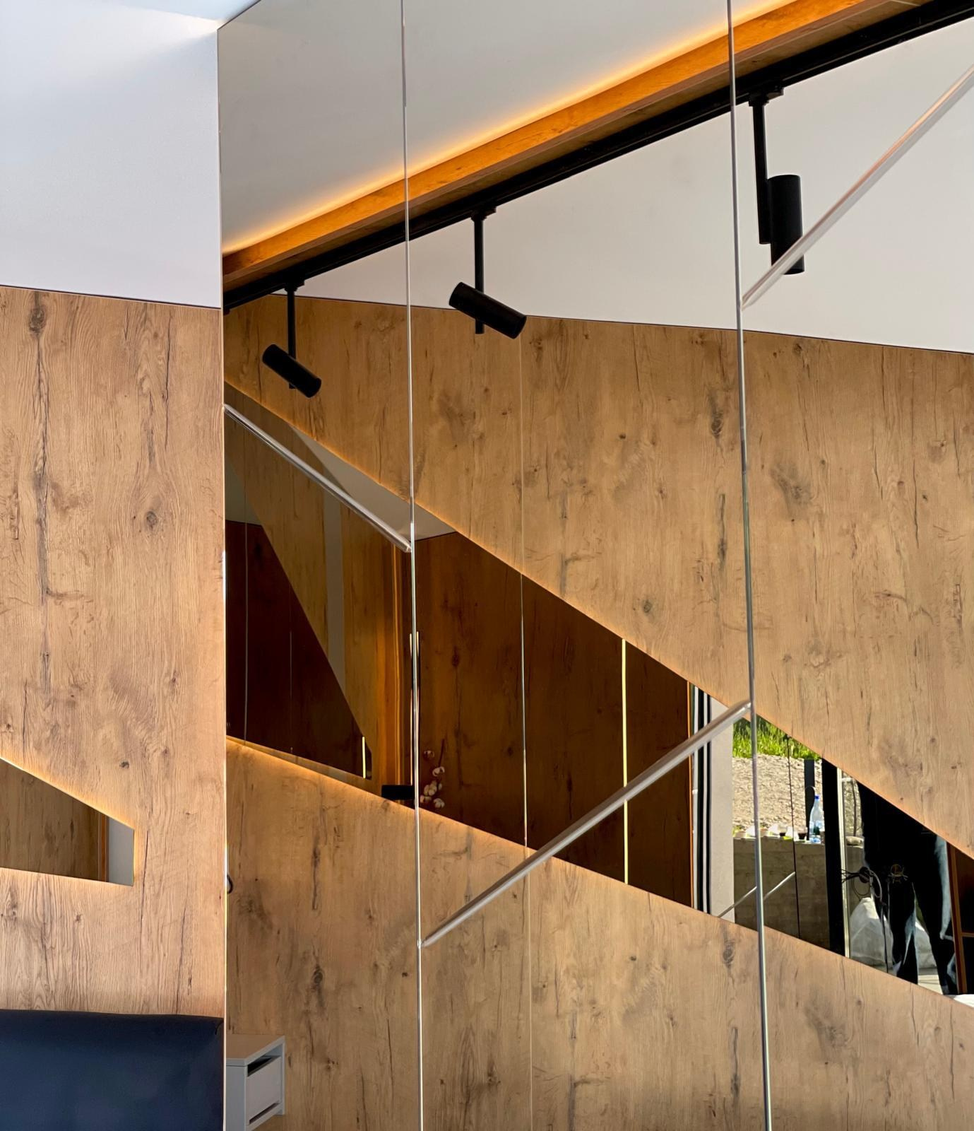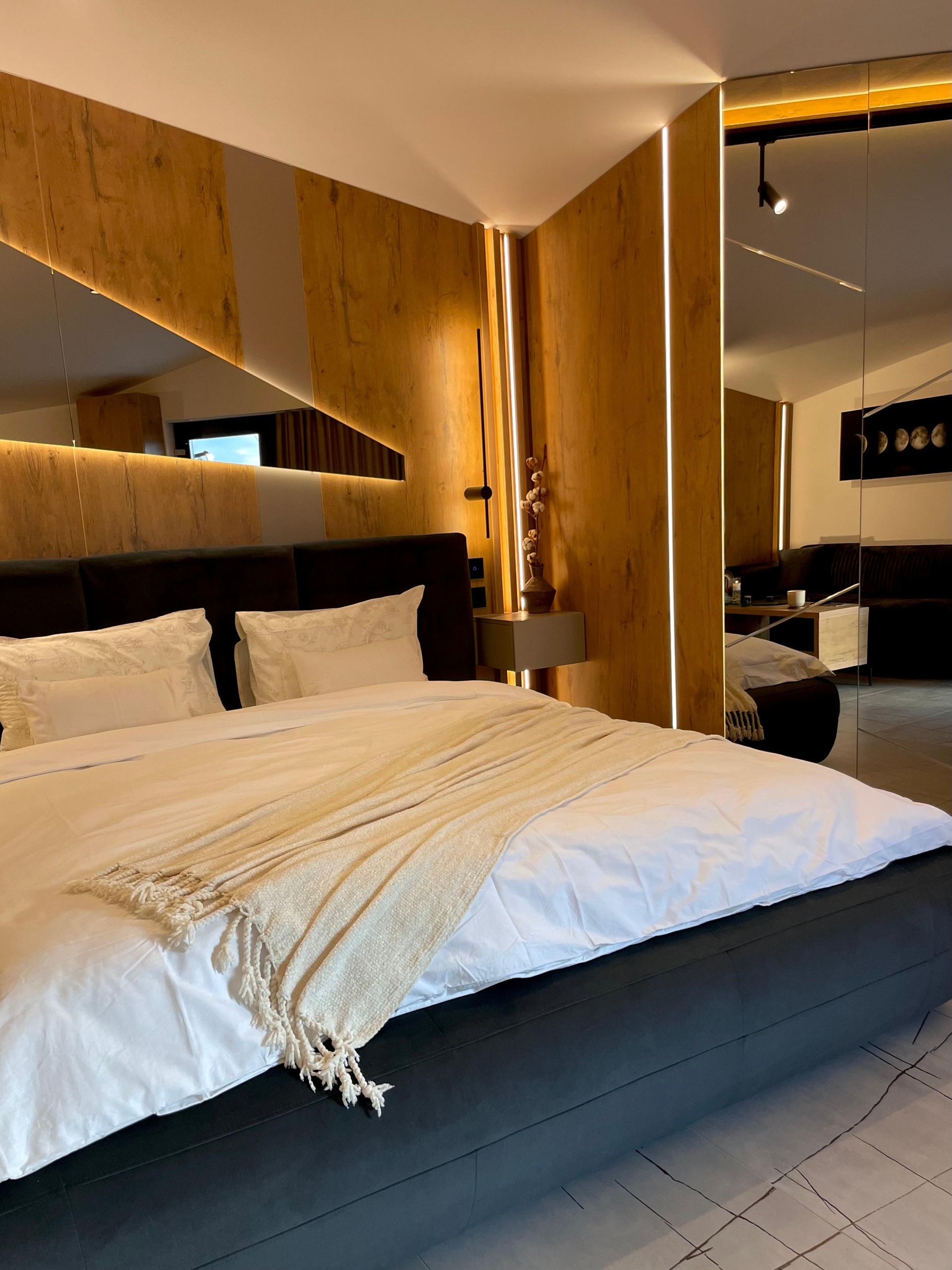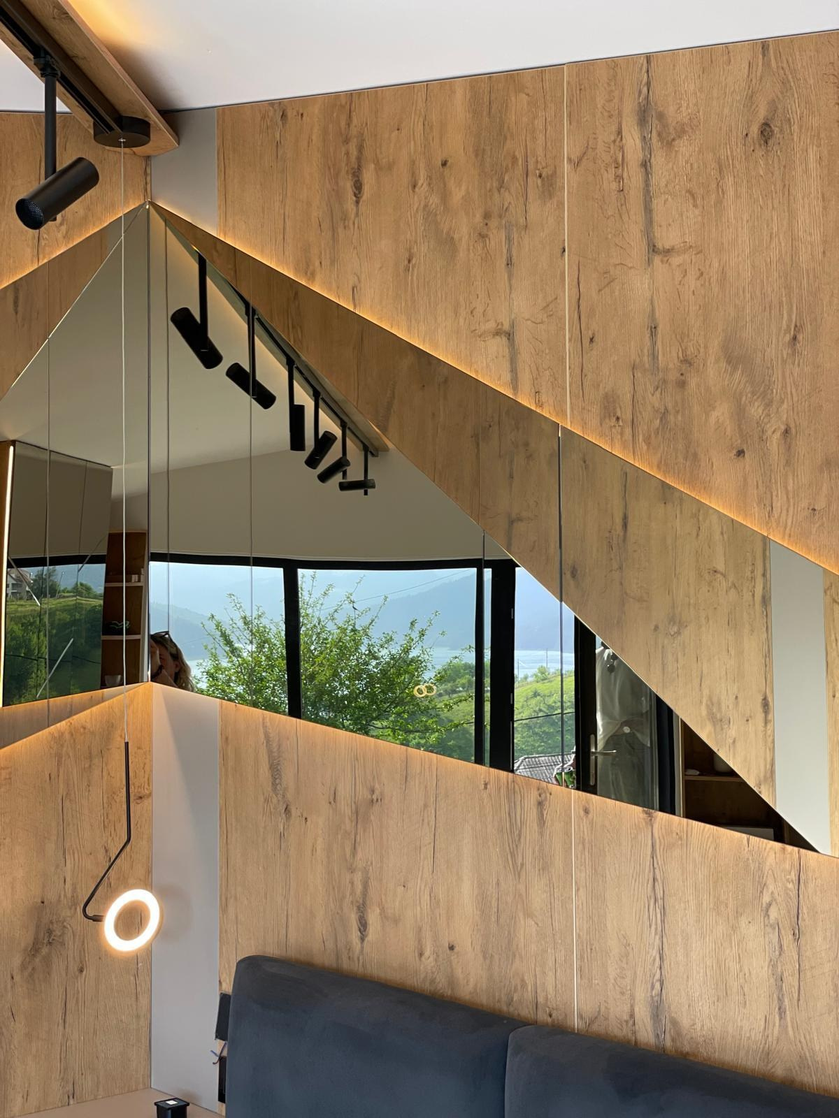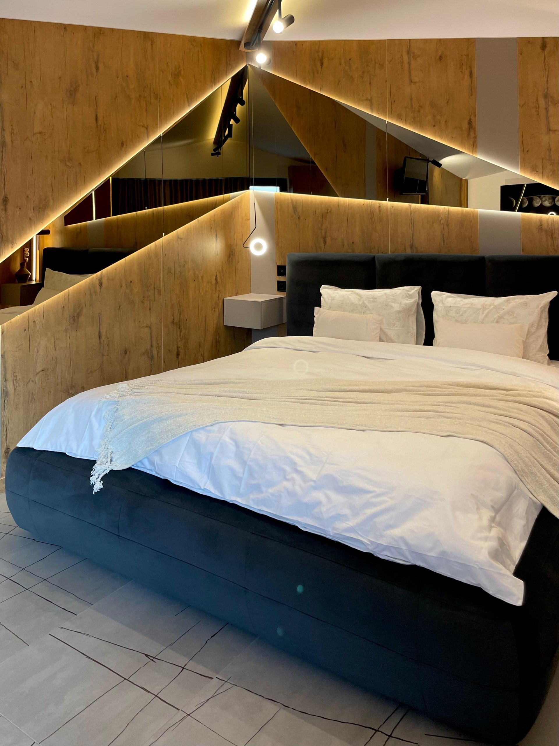 - Proiectul Amumi 1 aduce împreună naturalețea lemnului și eleganța modernă, creând un spațiu cald și intim. Jocurile geometrice ale oglinzilor și iluminarea ambientală dau profunzime și dinamism camerei, în timp ce texturile și culorile neutre transmit confort și rafinament. Rezultatul este un interior contemporan, primitor și sofisticat, unde funcționalitatea se îmbină armonios cu estetica.