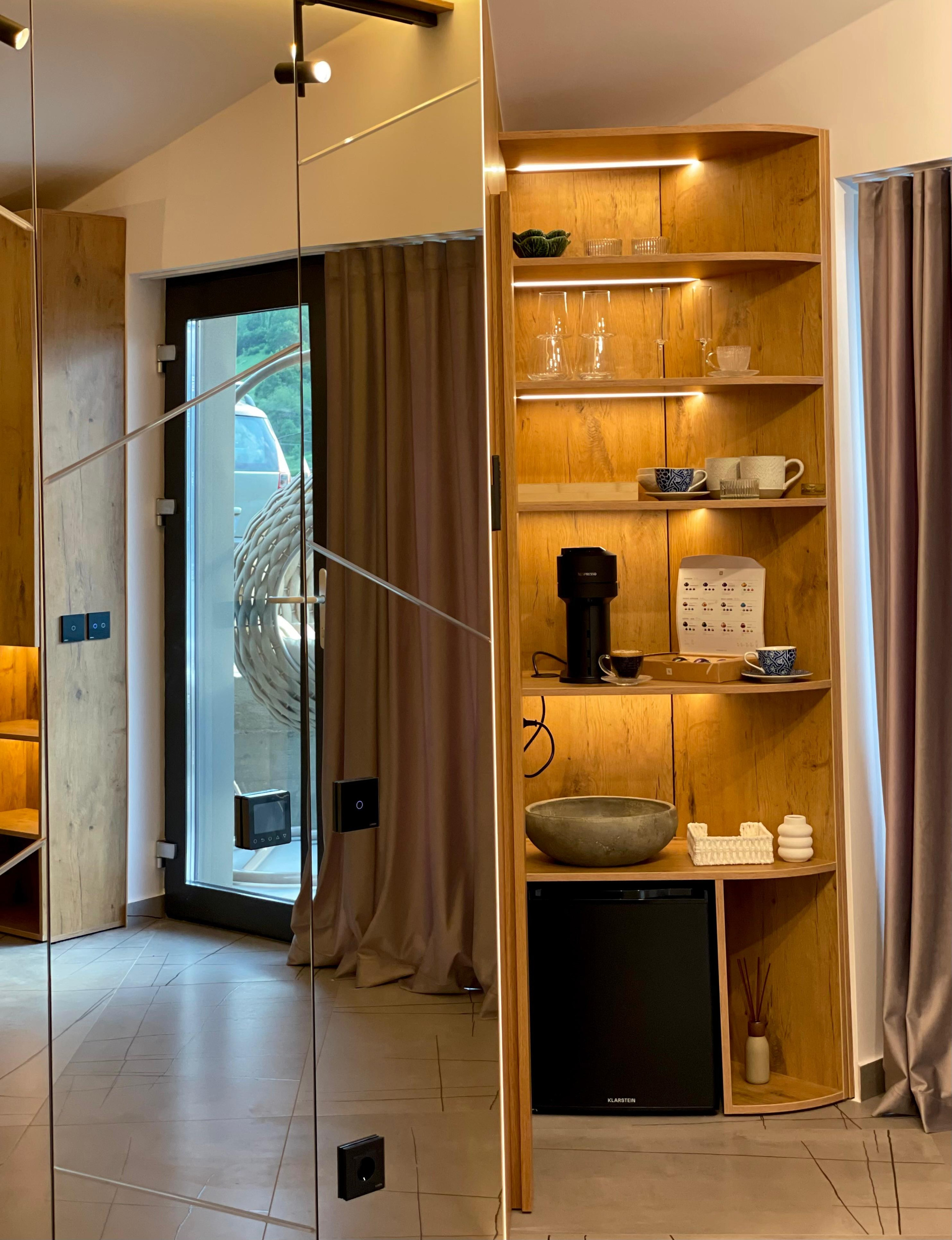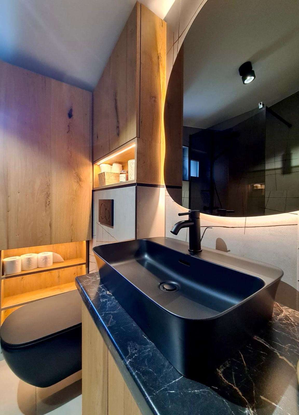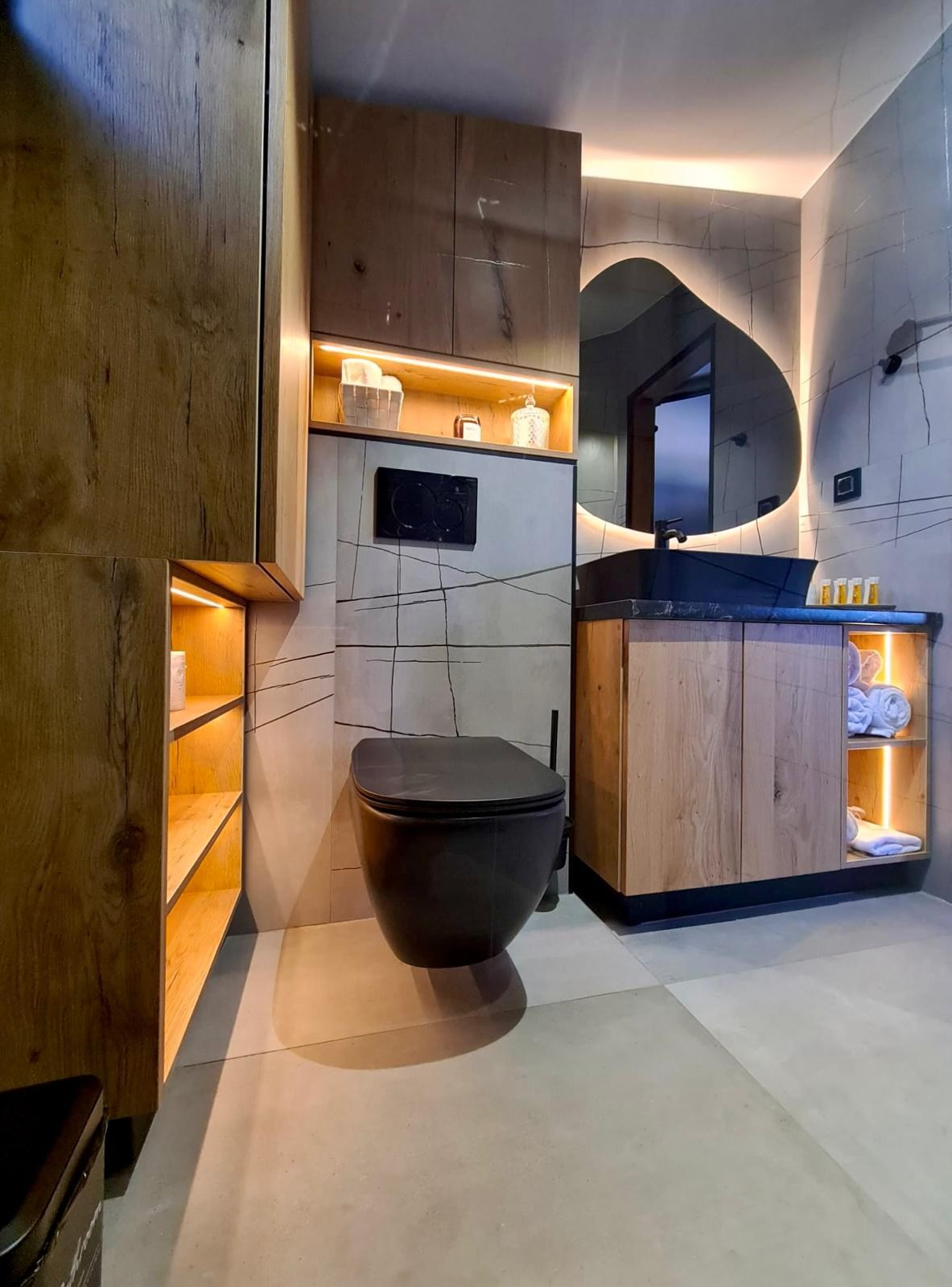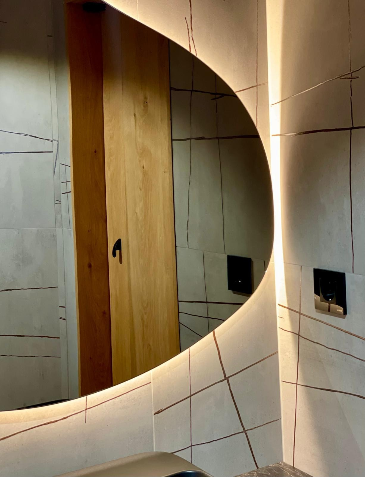 - Proiectul Amumi 1 aduce împreună naturalețea lemnului și eleganța modernă, creând un spațiu cald și intim. Jocurile geometrice ale oglinzilor și iluminarea ambientală dau profunzime și dinamism camerei, în timp ce texturile și culorile neutre transmit confort și rafinament. Rezultatul este un interior contemporan, primitor și sofisticat, unde funcționalitatea se îmbină armonios cu estetica.