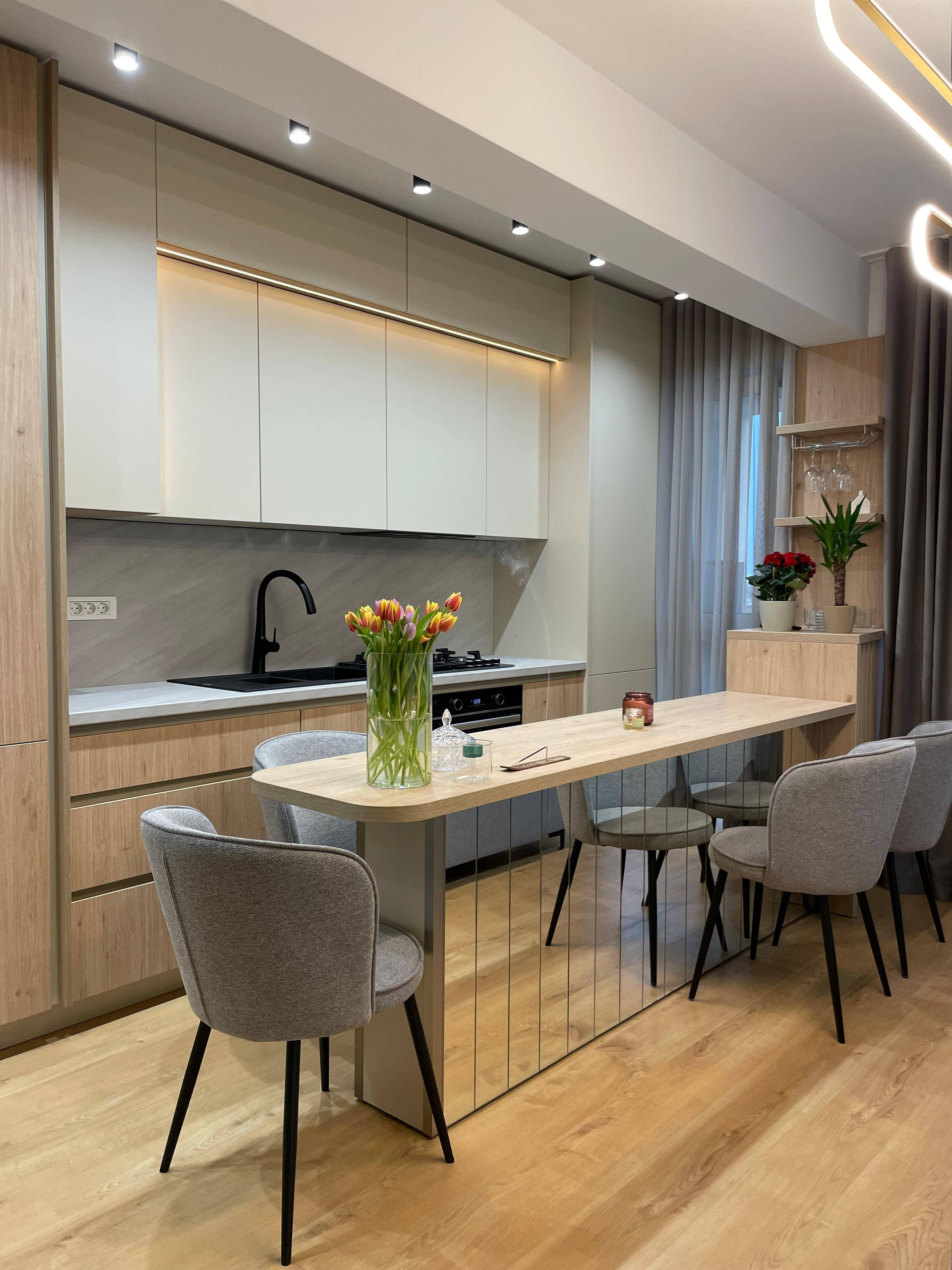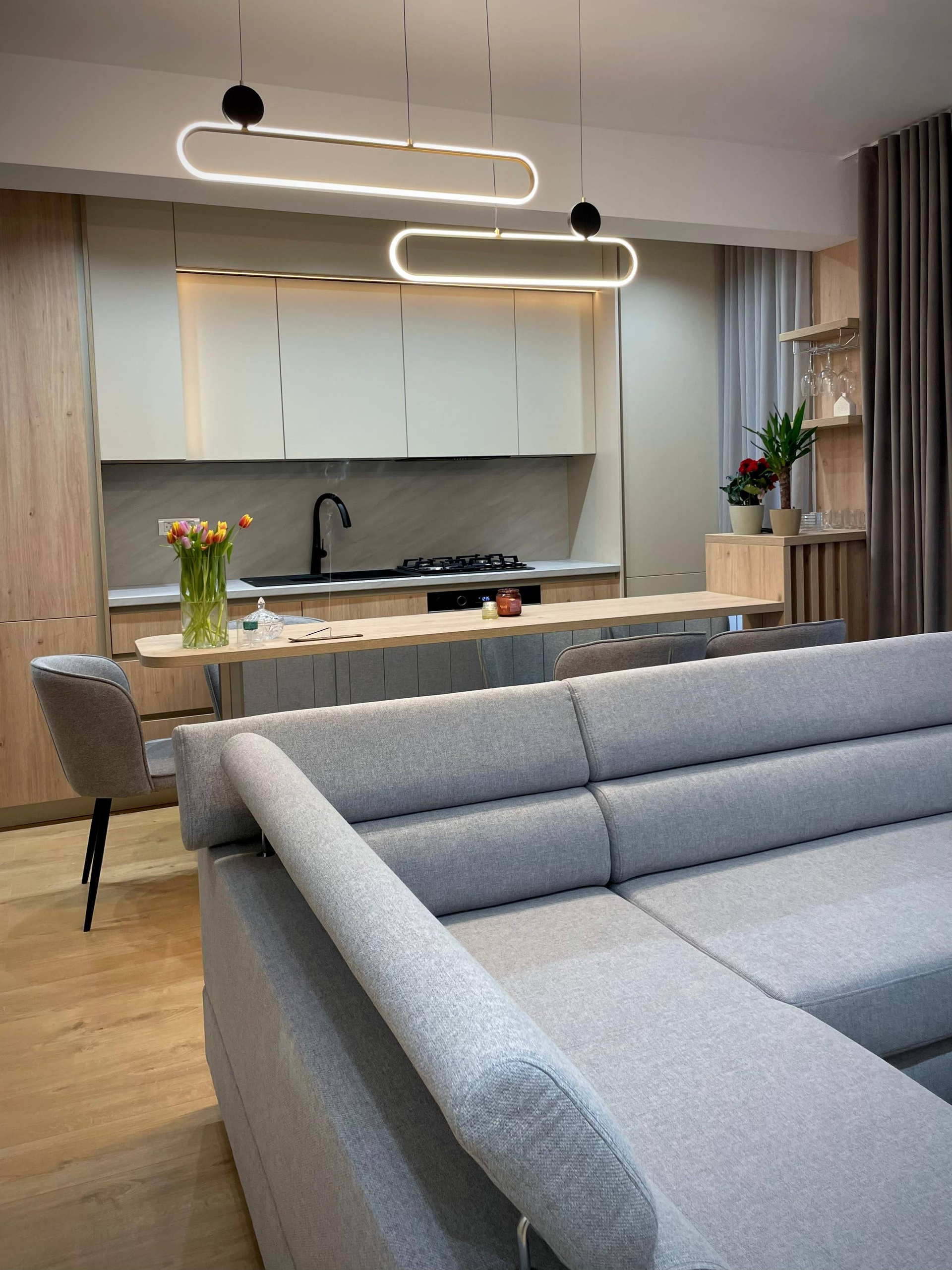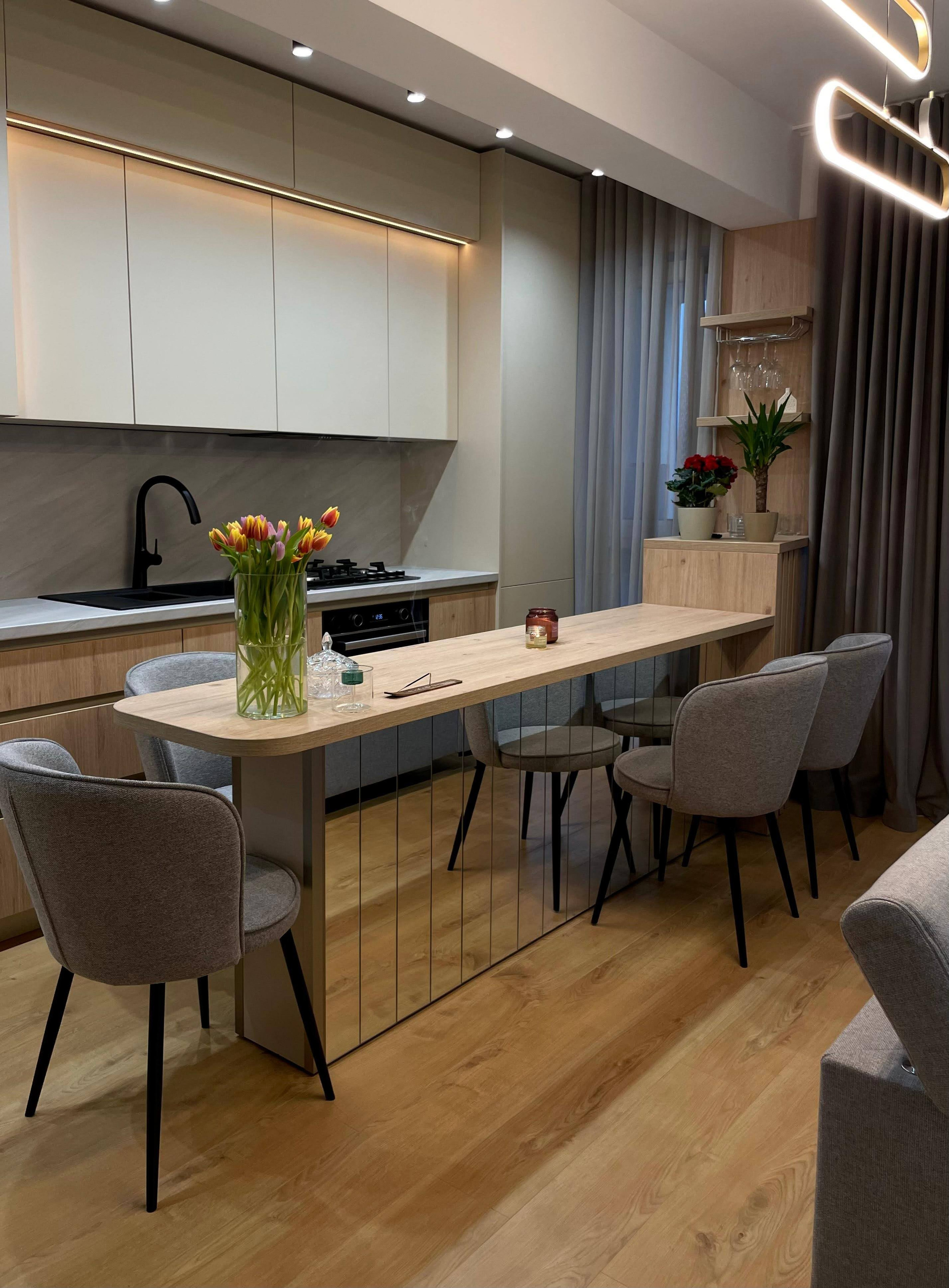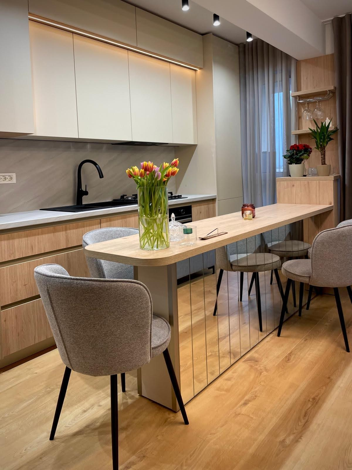 - Project B3 se remarcă printr-un design contemporan, definit de simplitate elegantă și detalii atent integrate. Bucătăria minimalistă, completată de insula cu reflexii subtile, oferă un echilibru între estetică și funcționalitate. Livingul este accentuat de linii moderne, oglinzi sculpturale și tonuri calde, creând un spațiu primitor și sofisticat.