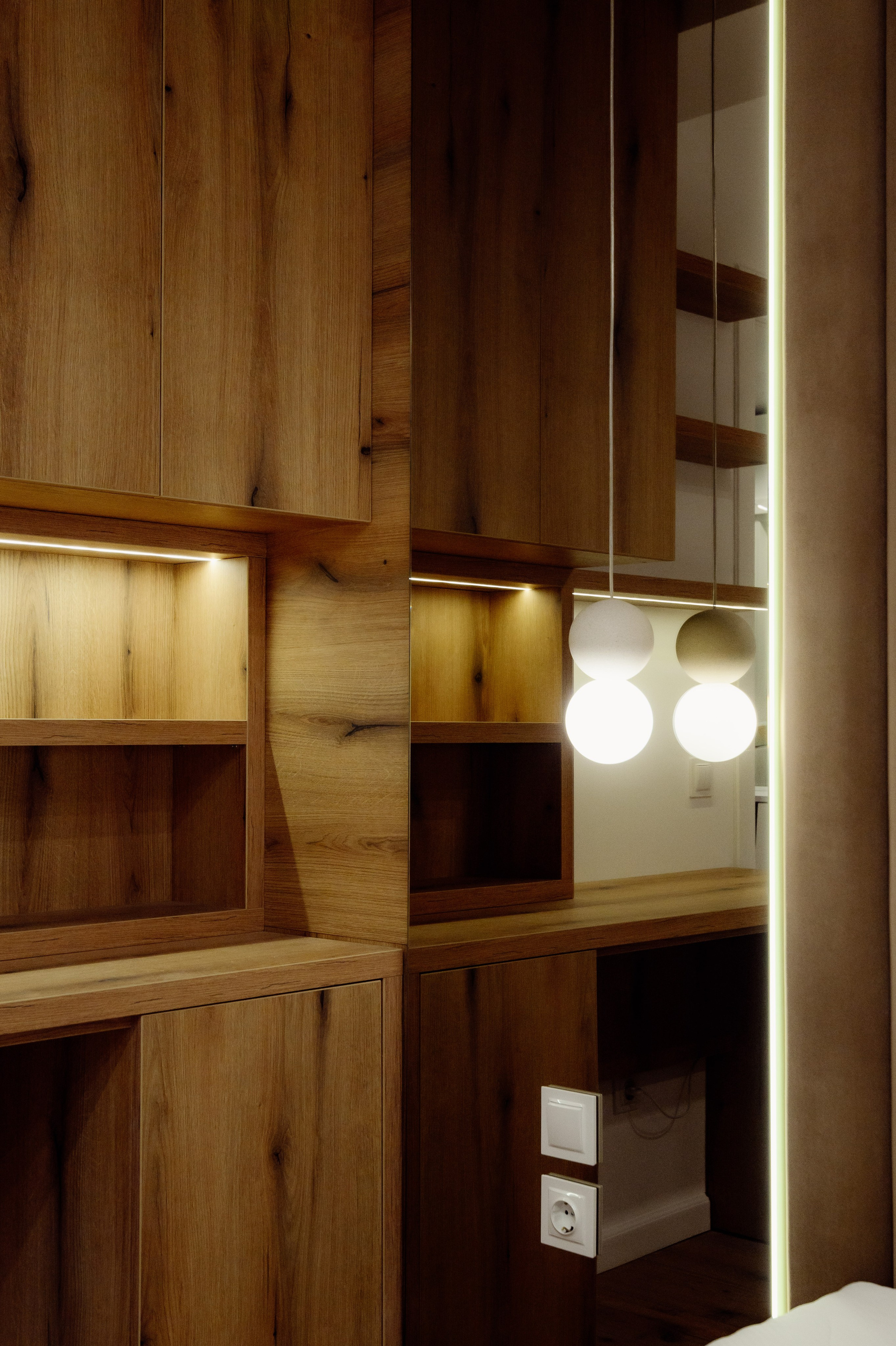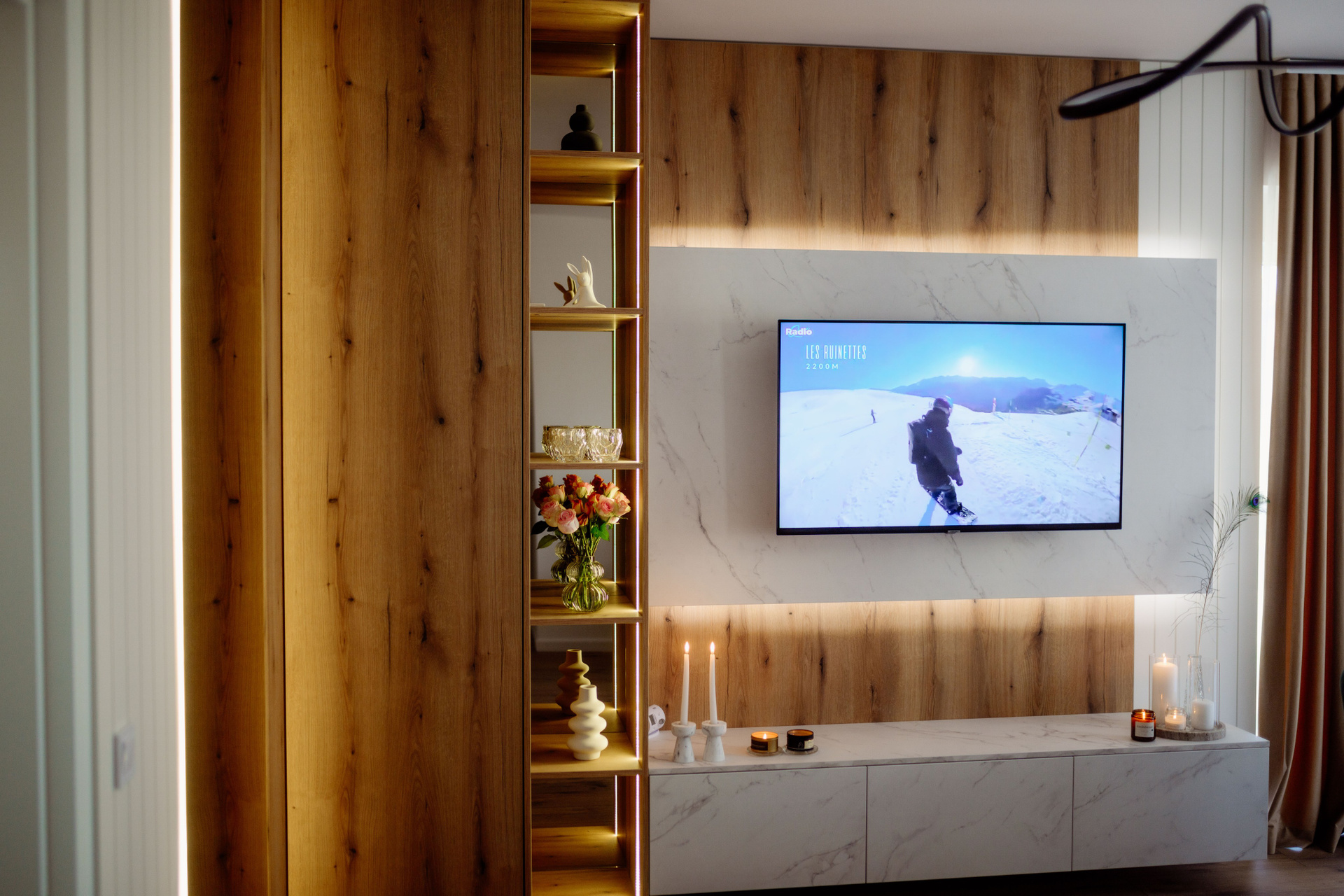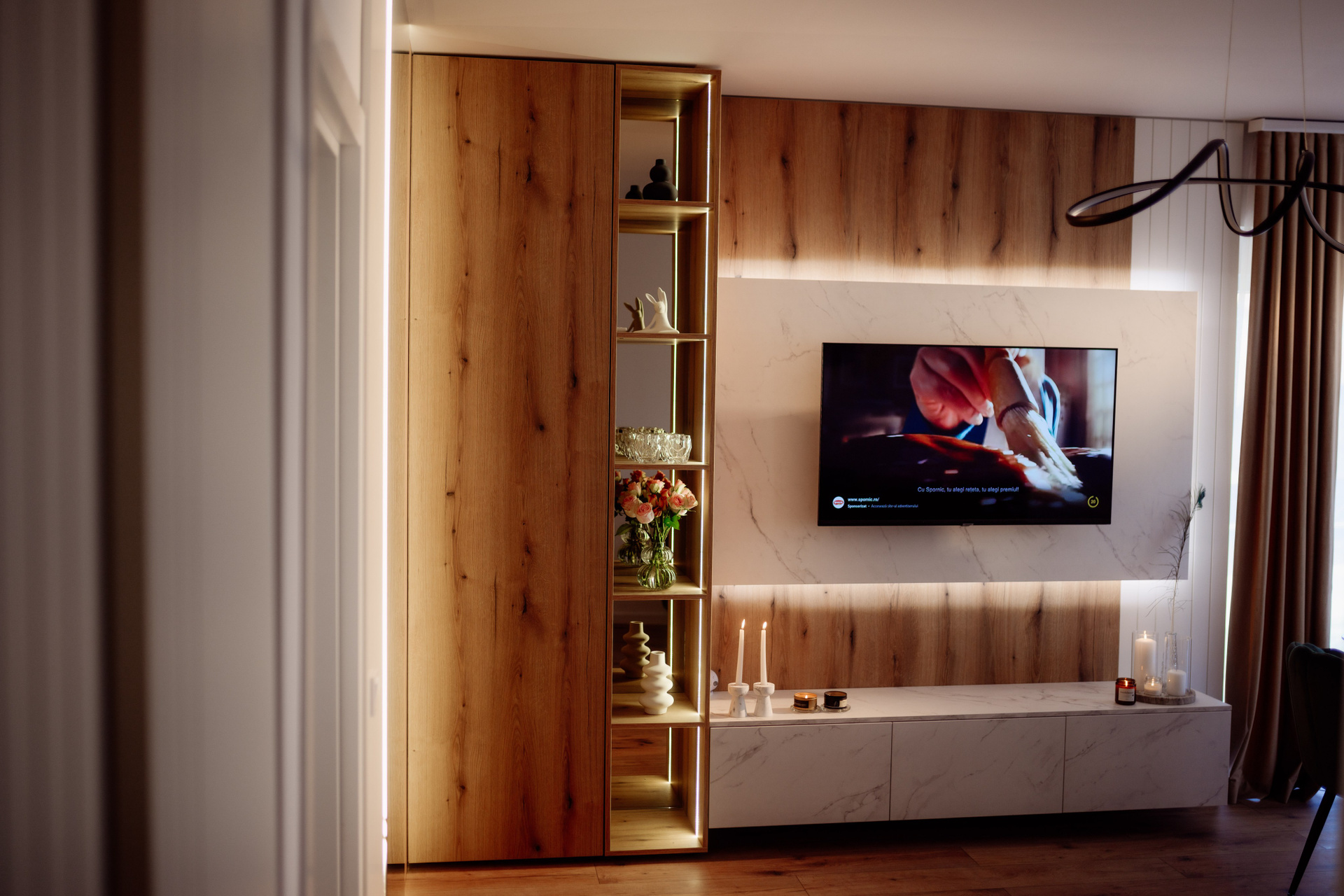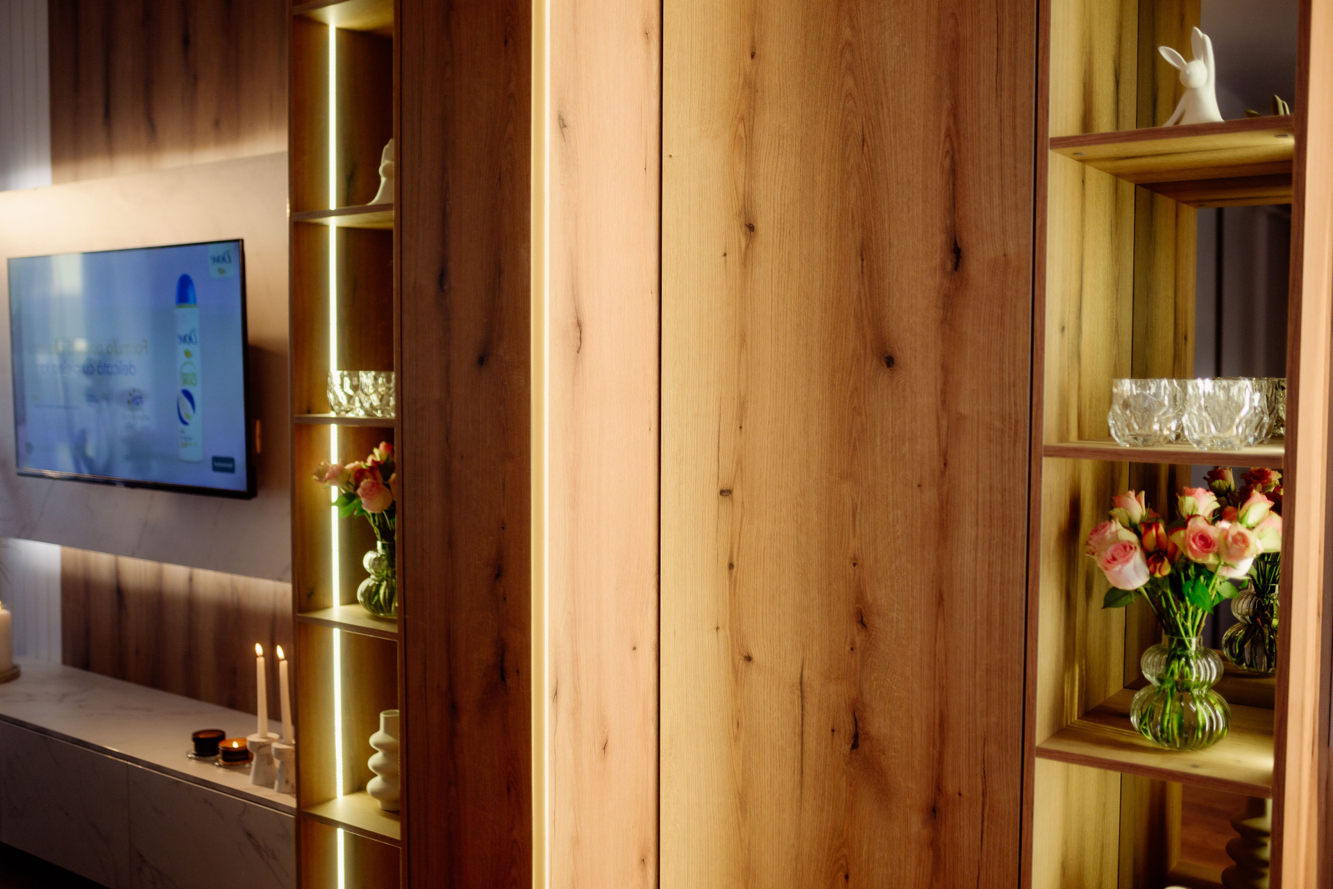 - Proiectul Freya se remarcă printr-un design cald și rafinat, în care lemnul natural devine elementul central. Texturile bogate, liniile verticale și iluminarea ambientală creează o atmosferă primitoare și sofisticată. Tonurile de verde smarald adaugă un contrast elegant, completând armonia dintre confort și estetică modernă. Rezultatul este un spațiu echilibrat, stilat și plin de personalitate.