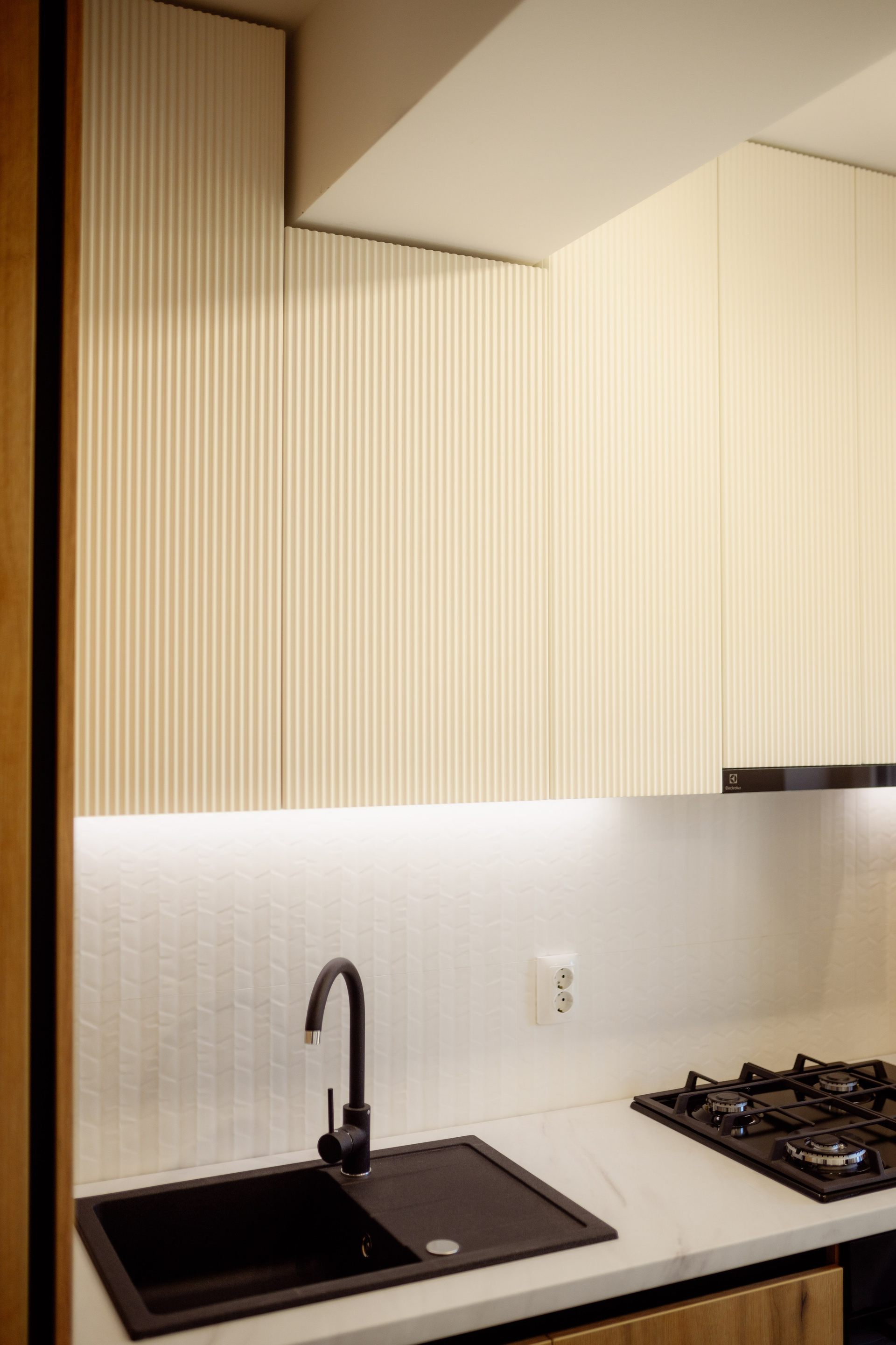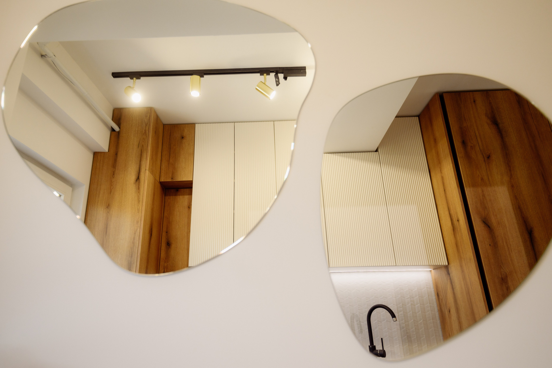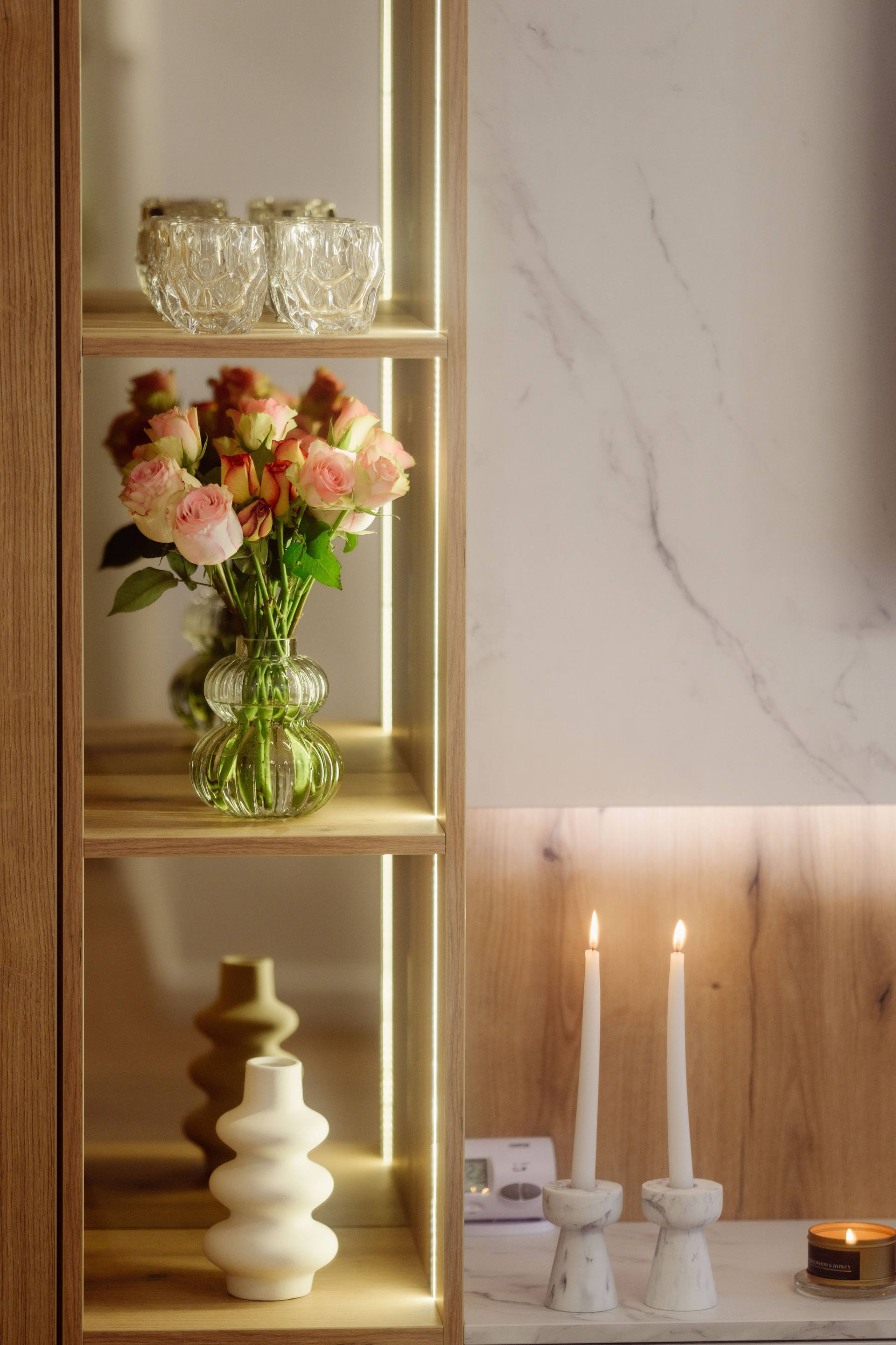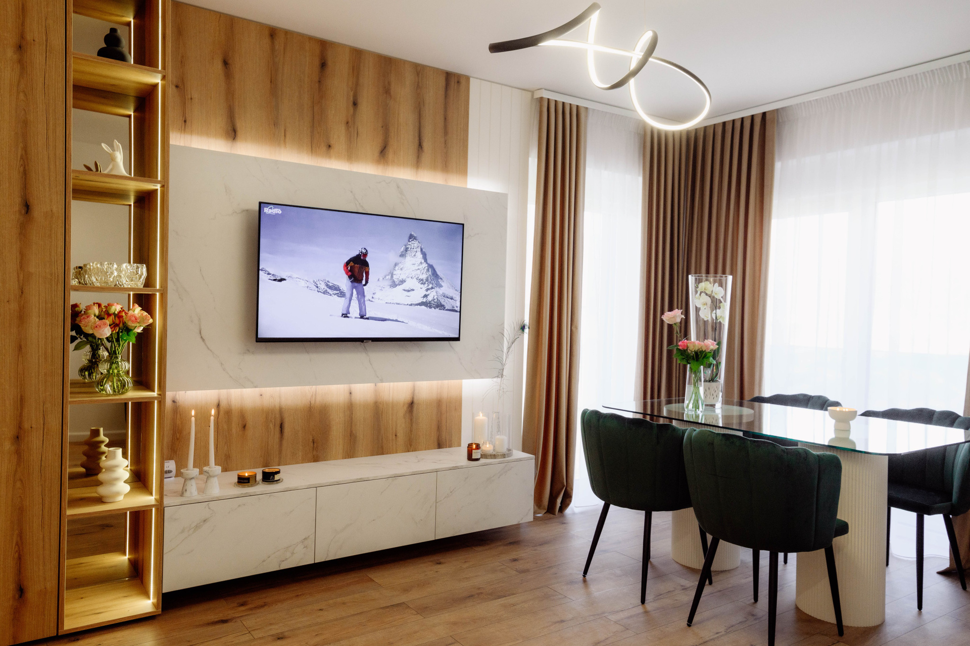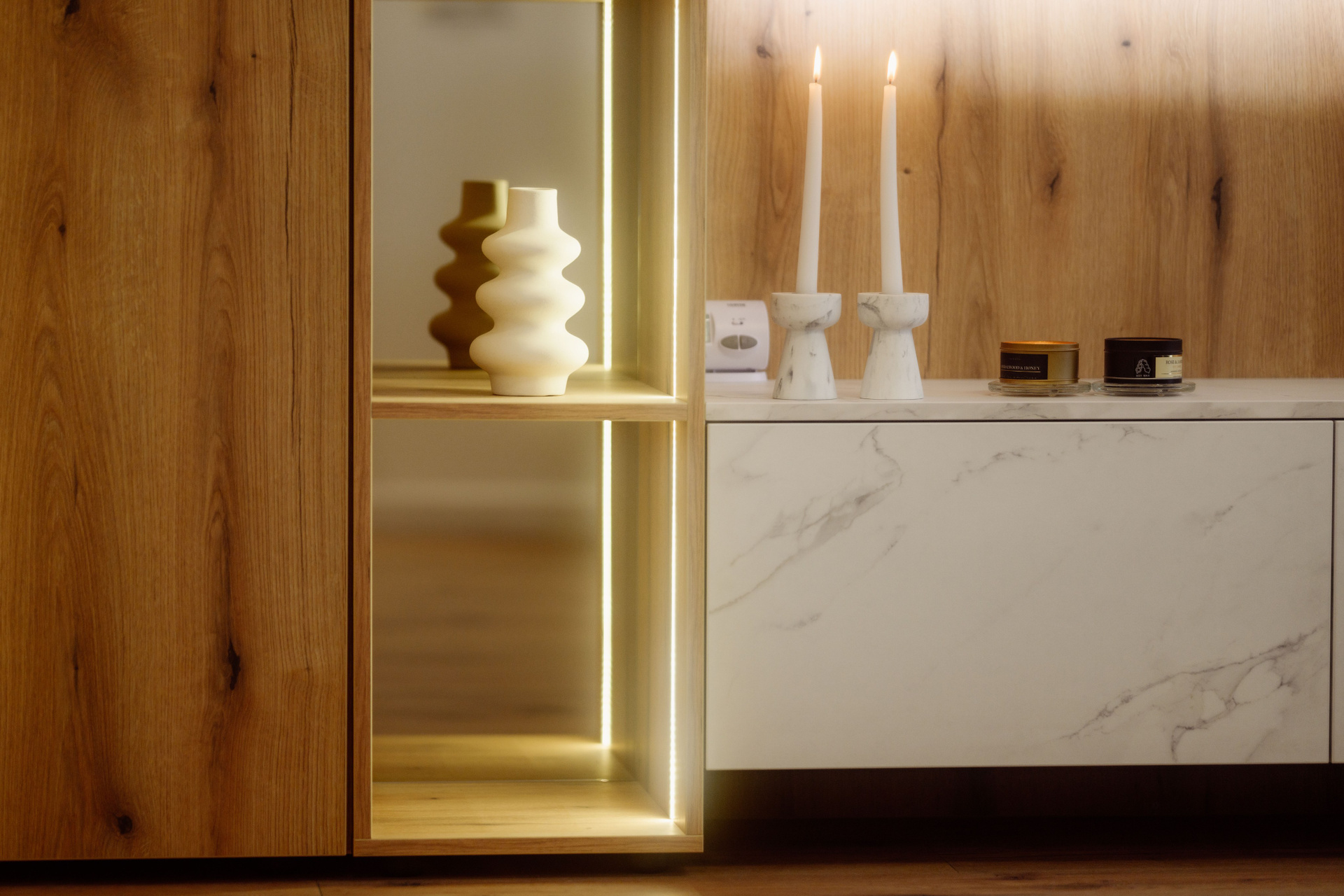 - Proiectul Freya se remarcă printr-un design cald și rafinat, în care lemnul natural devine elementul central. Texturile bogate, liniile verticale și iluminarea ambientală creează o atmosferă primitoare și sofisticată. Tonurile de verde smarald adaugă un contrast elegant, completând armonia dintre confort și estetică modernă. Rezultatul este un spațiu echilibrat, stilat și plin de personalitate.